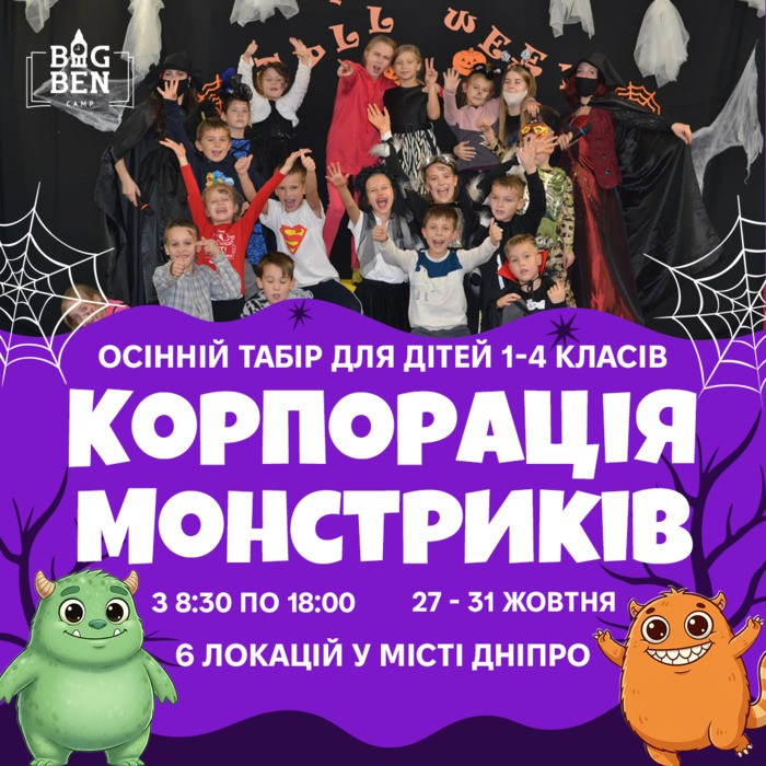 Холодніші дні, менше сонця? Для дітей у BIG BEN Camp осінь — це зовсім інша історія. Коли наближається Геловін — улюблене свято дітлахів — у повітрі відчувається загадковість, сміх і трішки магії. Саме так починається пригода в нашій «Корпорації Монстриків».