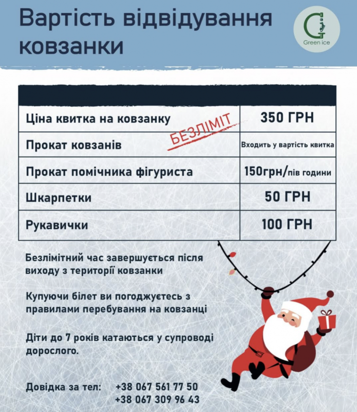 Безлімітний час катання діє до моменту виходу з території ковзанки. Діти віком до 7 років можуть кататися лише у супроводі дорослого.