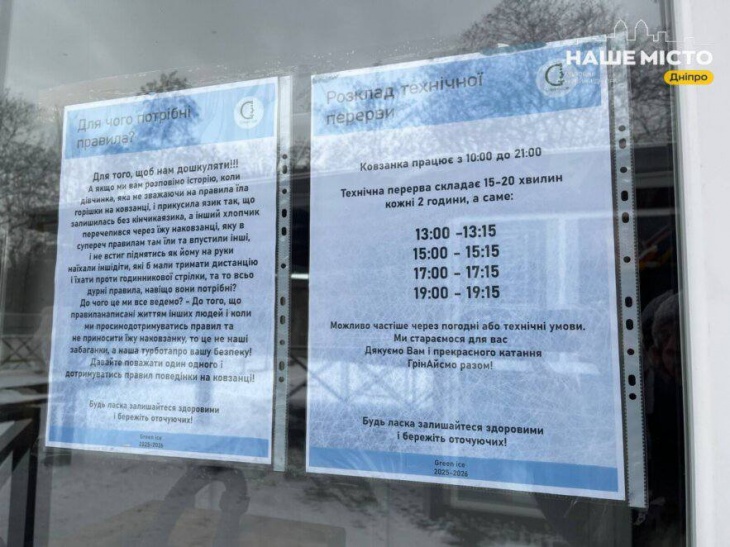 Ковзанка працює щодня з 10:00 до 21:00. Кожні дві години передбачена технічна перерва тривалістю 15–20 хвилин.