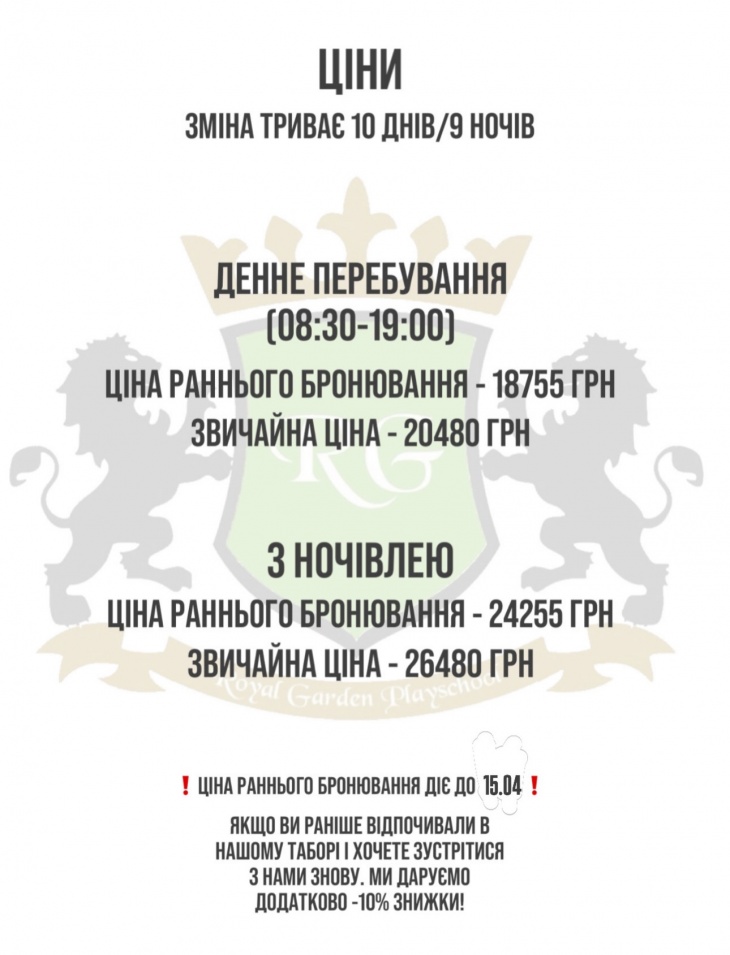 денне перебування: 20480 грн (з 09:00 до 19:00)