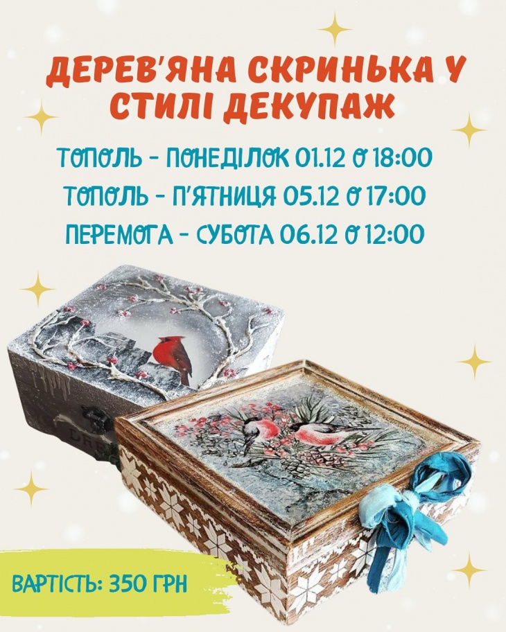 - Філія на Тополі — 1.12 о 18:00, 5.12 о 17:00